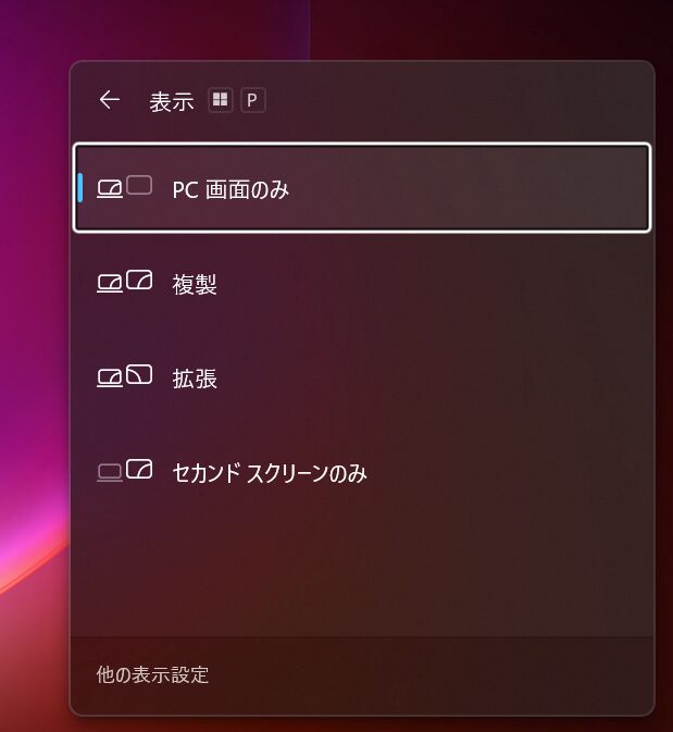 Win + P キーを押して「拡張」を選択。これでノートPCの画面とテレビが別々の画面として使えます。