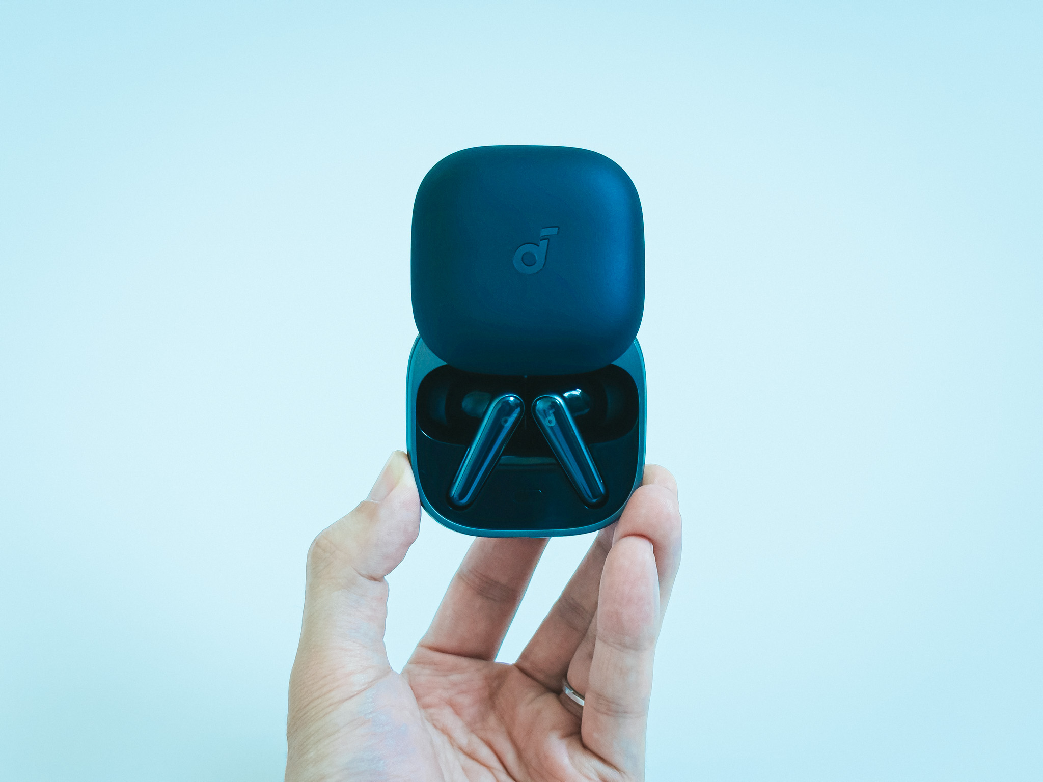 Soundcore Liberty 5のケースは正方形に近い形状で、ロゴを目印にスライドして開けます。